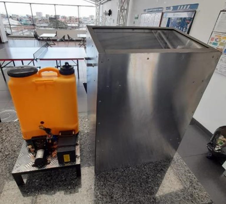 Fabricación de un dispositivo de humectación continua para medir el coeficiente de retro reflectividad. El dispositivo está compuesto por una cabina en lámina de aluminio para evitar la corrosión, en espesor de 2 mm, en la parte superior un acrílico transparente con el fin de visualizar su interior. En el armado de la cabina por medio de remaches pop con un empaque mantenga la hermeticidad de esta. Para el sistema de bombeo se considera el uso de una batería de 12 Voltios, una mini moto bomba a 12 Voltios, interruptor on/off que llevarán agua a un caudal determinado desde el tanque almacenamiento de agua hasta la cabina hermética.